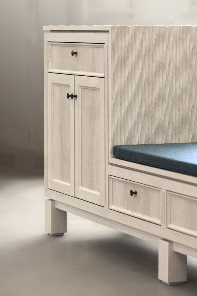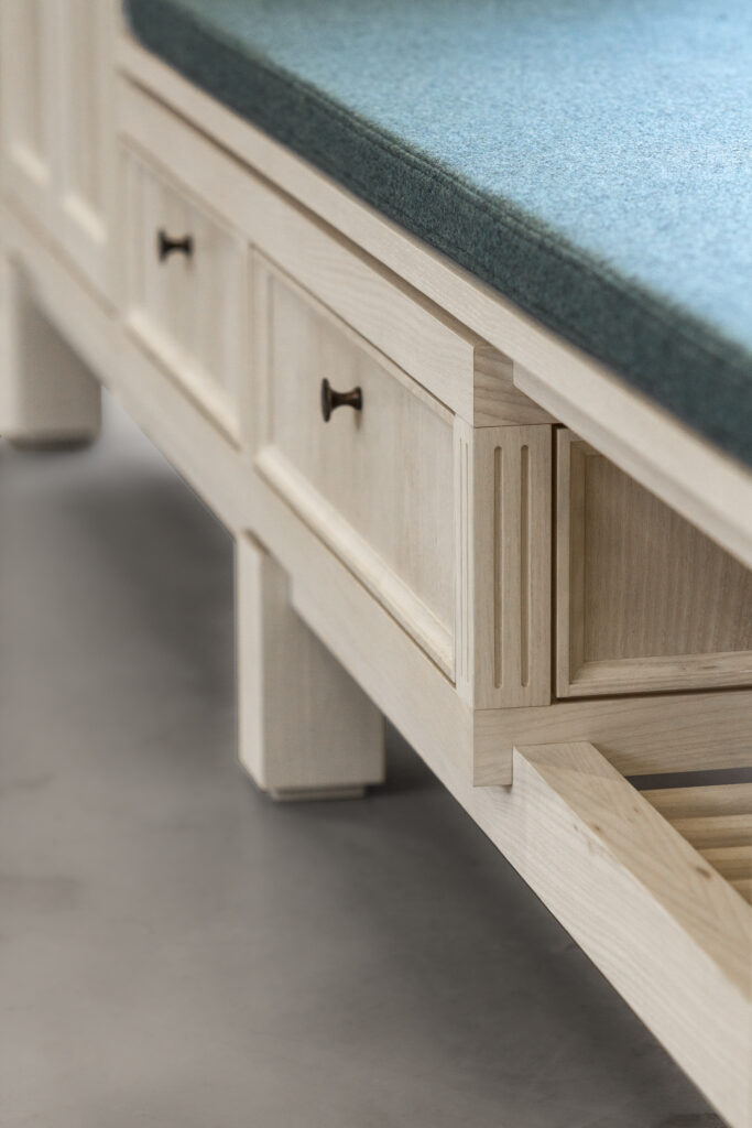 Hynden i stof er blød og imødekommende, så man kan sidde og tage sine sko på – eller få en lille pause. Opbevaringen er enkelt opbygget, men uden symmetri, for at understrege at det ikke er et serieproduceret møbel. Bagsiden er også færdiggjort, hvilket muliggør fri placering i rummet. Det skal ikke nødvendigvis stå op ad en væg.